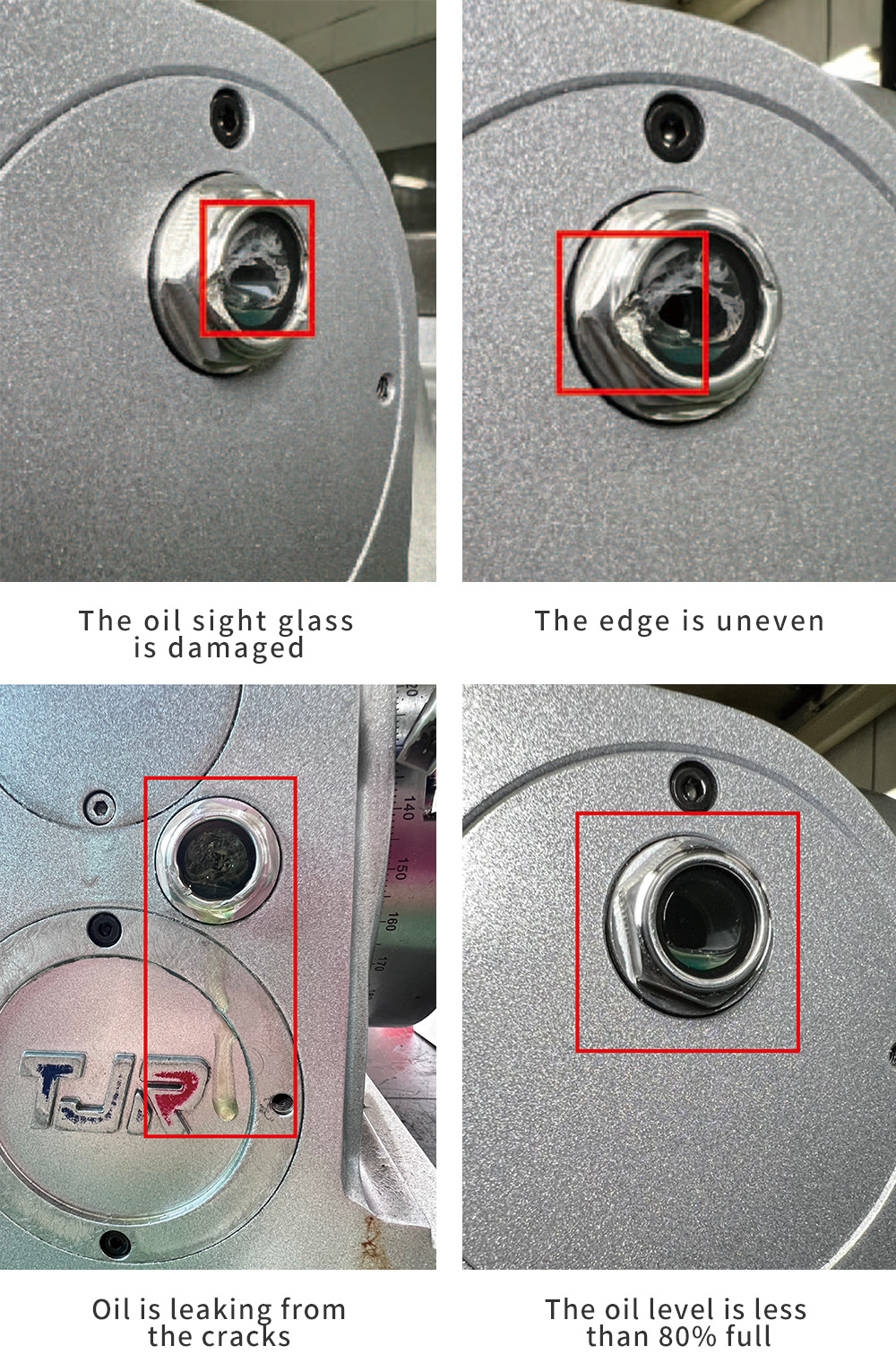 If the edge of the sight glass is uneven or cracked, the entire mirror is shattered, and oil is leaking from the cracks, or if the oil level does not reach 80%, it is considered defective.